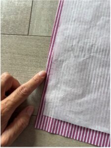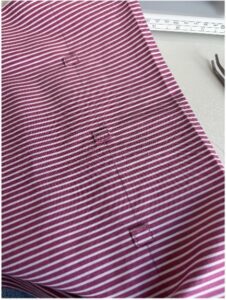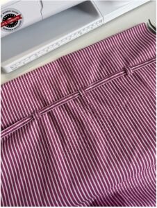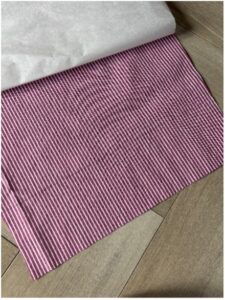 - Je knipt 2 stroken (in de lengte van de stof als je met streepjes werkt) van 70 cm x 4 cm. Dit worden de striklintjes van de mouwen.