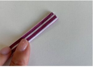 - Vouw de striklinten in de lengte dubbel en strijk plat. Daarna vouw je beide zijden naar de middenvouw en strijk je die plat. Je hebt nu 2 lange lintjes van 70 cm lang en 1 cm breed. Je kunt de uiteindes naar eigen voorkeur afwerken. Ik vouw het netjes naar binnen, maar hiervoor zijn meerdere opties. Je blijft beide uiteinden natuurlijk zien, dus hou daar rekening mee.