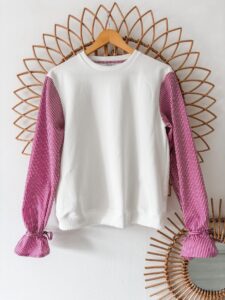 Een trui met blouse-mouwen maken? Met deze tutorial is het een fluitje van een cent. Voor de trui volg je grotendeels de beschrijving van Sweater Élodie uit Poppy meets Pommé nummer 25.